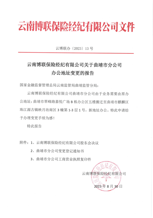 云南博聯(lián)保險經(jīng)紀有限公司關(guān)于曲靖市分公司辦公地址變更的報告