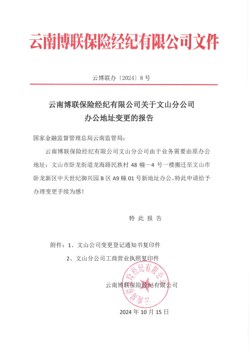云南博聯(lián)保險經紀有限公司關于文山分公司辦公地址變更的報告